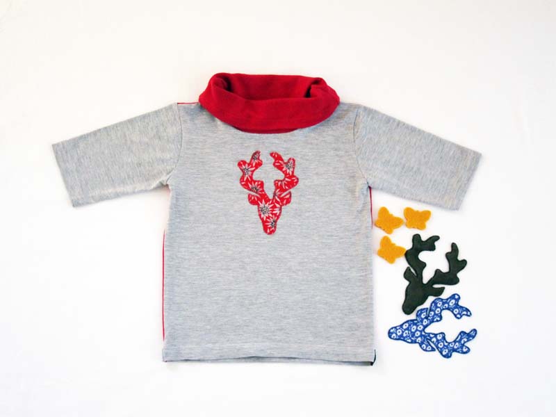 Schlagworte: applikation, grau, Hirschkopf, rot, t-shirt